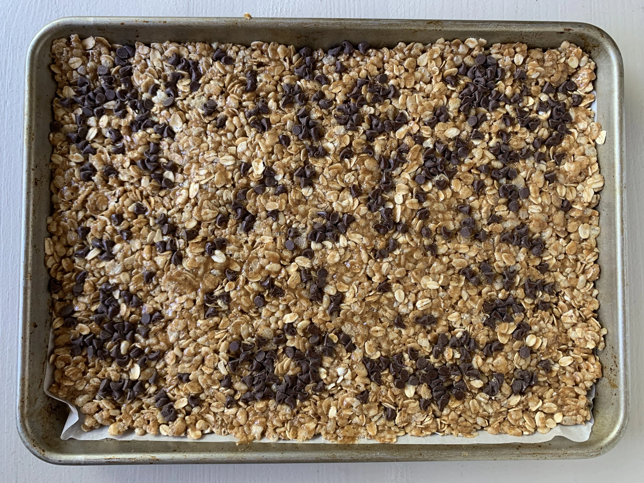 - Place parchment paper over a 13 x 18-inch baking sheet. Pour granola bar mixture onto parchment paper and press with a sheet of wax paper until flat. Sprinkle mini chocolate chips on top of mixture and press again, until evenly flat.